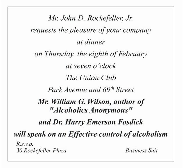 DIGEST OF PROCEEDINGS AT DINNER GIVEN BY MR. JOHN D. ROCKEFELLER JR., IN THE INTEREST OF ALCOHOLICS ANONYMOUS, AT UNION CLUB, NEW YORK CITY, FEBRUARY 8, 1940. Mr. Nelson Rockefeller, after the dinner, called the meeting to order and expressed regret that his father would be unable to be present, but that Mr. Scott, president of Lockwood Greene Engineers, Inc., would take over the meeting at this point, Mr. SCOTT: “It is a very difficult situation to pinch hit for Mr. Rockefeller, but Nelson and I have agreed between us that we are going to do the best we can. Mr. Rockefeller asked me particularly to say how much interested he was in the work that is being done and how very sorry he is that he cannot be here, and how much he appreciates the fact that you gentlemen have come out to hear what is to be said. My own experience with this group dates back to December 1937. I was asked to attend a meeting in Rockefeller Center and I met some fifteen or eighteen men there and I heard a story that thrilled me from the start. Mr. Wilson, Dr. Smith, Mr. Mayo and some of the others who are here tonight told of their experience in getting control over alcoholism. The thing that particularly impressed me as a businessman was that this was done without any theatrics, without any strong appeal to the emotions, without any effects or any activities, which perhaps a conservative person might criticize. What they had done, it seemed to me, had gone back to the techniques of primitive Christianity, where one person told the good news to another. And it did not seem to make much difference whether the person they told it to was a Jew, a Protestant, a Catholic or nothing at all. If he observed the techniques which had been developed and reached out into the unknown and asked for help, the help came. I am not here to make a speech but to introduce the other speakers. I first want to introduce my friend Bill Wilson, who is at my right. Of this group Bill Wilson here has been the leader. He is almost, if not entirely, the originator of the undertaking. I know you will all want to hear from Mr. Wilson, and now I present him to you -- Bill Wilson.” Mr. WILSON: Mr. Chairman, Mr. Rockefeller, friends and guests: If there is one thing that most people would like, it is to recover the good things they have lost. With us who have been alcoholics one of those good things is the regard of our fellow men. Therefore we are especially grateful to you gentlemen because your coming here is a mark of renewed confidence, and we want to thank you for the opportunity of presenting the little story of what has happened. I might start off by giving an account of a man whom I have not seen for two or three years. His experience so well illustrates the nature of the problem with which we have been dealing. This man was a rich man’s son, and I can pay him no greater tribute than to say that he was very successful in business; I think that is a real tribute. He was a person of dignity, good taste, education. He had a great many friends. Well, he did a conventional amount of drinking, and that went along nicely a number of years, and then he found that he began to get drunk, very much to his own consternation, for he had looked down upon people of that type before. I have indicated, I think, that he was a person of character, and great force of character. Therefore the question immediately arises in everyone’s mind: “Why didn’t he stop?” But he did not. Little by little matters got worse and he began to go from one hospital or cure to another. He consulted psychiatrists. He began to make a study of himself, and of this thing, which is called alcoholism. Little by little the realization dawned on him that although he might have been foolish in drinking too much, now he had become sick. In desperation he went to Dr. Jung in Zurich, who is considered by many physicians the world’s leading authority on the alcoholic mind. There he was under treatment, I believe, for a long time. In the course of that treatment he said to Dr. Jung: “Doctor, you are for me the court of last resort. Will you please tell me how serious this is and where I get off?” And the doctor said: “It is this serious. I have never seen one single case where the alcoholic’s mind was in the state that yours is that ever recovered.” And our friend said: “Ever recovered? Are there no exceptions?” And the doctor said: “Yes, there are some exceptions - those cases where men have had so-called vital spiritual experiences.” An expression of relief went over our friend’s face as he said: “Well, Doctor, I am a good Episcopalian. I used to be a vestryman before I got so bad.” The Doctor shook his head. “That is not enough to expel this obsession which you have, this so-called compulsion neurosis.” So our friend said, “What next, how do I get one of those things?” “Well,” the Doctor said, “I don’t know. Certain orders in the Catholic Church have had success with alcoholics. The Salvation Army…priests and ministers partially … Christian Science … But these successes have been only occasional, sporadic.” And he added, “I don’t know whether the lightning will hit you or not. You might try. Otherwise you may as well shut yourself up, because if you don’t you will die.” That is a typical statement of the alcoholic’s dilemma. It describes in a loose way a condition in which we have gone from habit to obsession, to insanity. And the very strange thing is that while this is going on, many of us seem to all outward appearances to be sound and able citizens in other respects. Our minds waver, and we wonder what in thunder is the matter. Recently I attended a dinner given by the Research’ Council on Problems of Alcohol. Several of the country’s leading authorities on the subject spoke. At the end of the meeting, the chairman, urging the need for research, called attention to the fact that all of these authorities were i