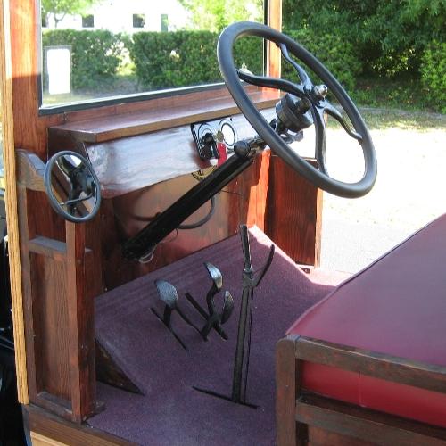 Let's start with the hand lever. All the way back it sets the rear wheel parking/emergency brakes and puts the transmission in neutral. Half-way released it maintains neutral, and fully released it engages the planetary transmission in high gear. Feel it a few times, notice that it holds the left pedal in neutral mid-position, then release it, and notice that the left pedal is all the way up. Next, the lever to the left beneath the steering wheel is the spark adjust advance/retard from before top dead center ignition to after top dead center. To retard the spark it is moved up, to advance the spark it is moved down. The Model T is always started in the retard position, as it was designed to be started by hand cranking. Unless it is retarded the engine can and will KICK BACK and do damage to hands, wrists and arms. NEVER crank it except in the retard position. After the engine is running, the lever can be moved down to advance the ignition until the engine chuckles smoothly, and when rolling to get the best performance. The lever to the right is the throttle lever, there is no foot pedal like a modern car. Up is idle speed, down is as fast as it will go. Maximum performance in a Model T is like with a mule, with both ears laid back.