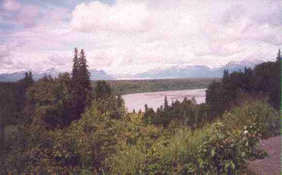 The road toward Anchorage from Tok is in good shape, but frost heaved in all directions. I quickly found that if the roadside warning says "bump" it is no real problem. It is the "dip" warning that you have to watch out for. We tooled along for about 100 miles, making camp on the Chistochina River near Gakona in a mostly abandoned state park area. We were off the highway a couple hundred yards. There we met Jonas from Switzerland riding across the states to Alaska on a bicycle. Beans and rice for dinner. Finally used the solar shower, heating a couple of gallons of water in the afternoon sun. I rigged a pole to push it up and lean it against a limb on a tree. The shower was great. Nice to know that the thing works. It only took about an hour and a half in full sun to warm the water to comfortable from frigid.