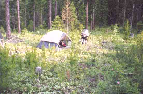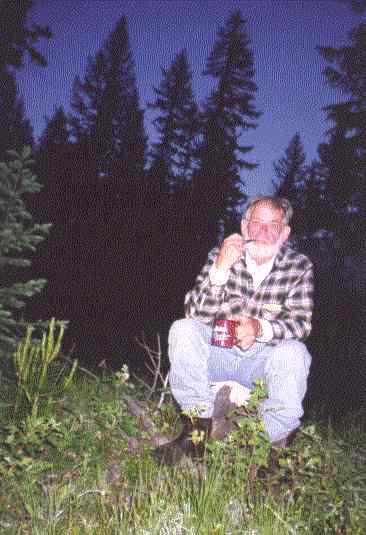 We pulled off the highway near Christina Lake onto a dirt road going up the hill, and drove back about a mile to a open grassy clearcut ridge, with a small stream running alongside, down about 50 yards. We made camp 200 yards out on the ridge right in the middle of the old logging road. This was the first "roughing it" camp that Nancy had ever experienced. I set up a cooking tripod from 3 forked limbs, started a fire and coffee brewing. Nancy did the honors of cooking from our meager stash and we had a good meal. The night was clear, the stars and moon out, the fire was right for meditation and the enjoyment of good company.