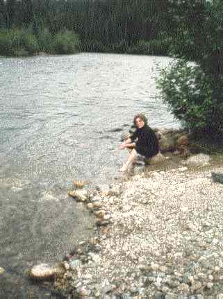 From Takhini we headed north toward Dawson, crossing the Yukon River at Carmacks. We made camp on the Klondike, about 40 klicks out of Dawson. We played in the river, made a good dinner, no mosquitoes, enjoyed the evening, although you couldn't really tell it was evening. I watched the upper limb of the sun dip to the horizon at 11:45pm, skimming along the top of the distant hills. I woke from sleep about at 2:45 am and it was just full sunrise, the lower limb climbing clear of the ridges. The darkest it got was just dusk.