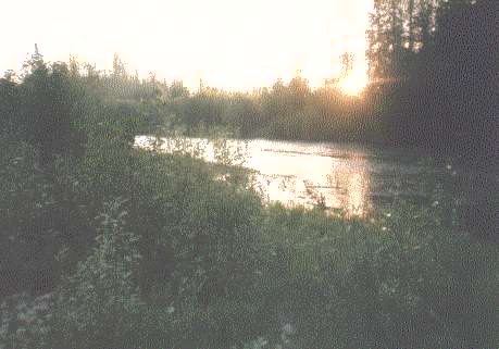 Traveling about 60 miles out of Anchorage, it started to rain so I found a creekside pavilion at an old burned out place alongside a pond and creek, made camp under the pavilion, and slept warm and dry in daylight at 1 am.