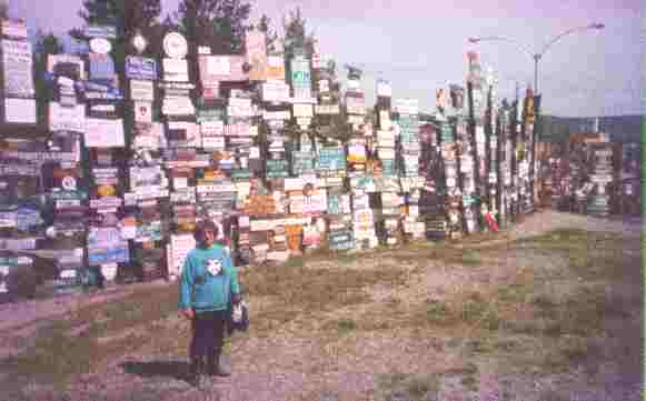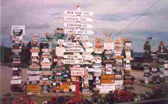 We got in the pool and soaked under the waterfall until about 8pm, got dressed and went across the highway to the Liard Lodge for dinner. Back on the road we stopped at Watson Lake again to wander in the sign forest again and to stretch our legs. We continued on and camped late on Prochniak Creek in a nice meadow.
