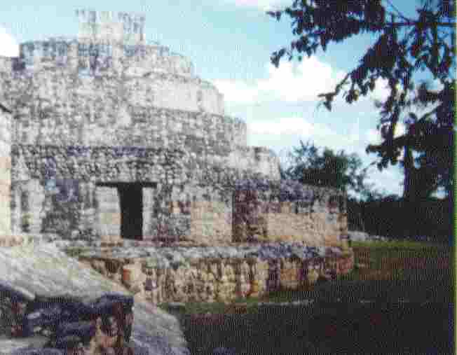 ![]() Warehouse Wall At Base Of Pyramid | ![]() Rounded Ends Of Pyramid Terraces | ![]() Ek Balam Pyramid From Across The Compound |