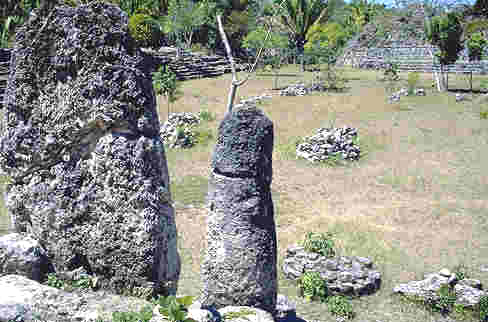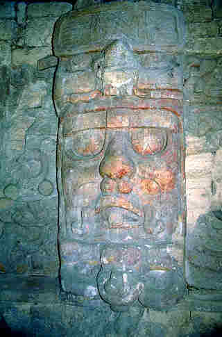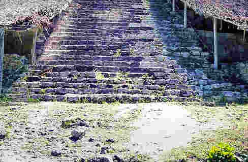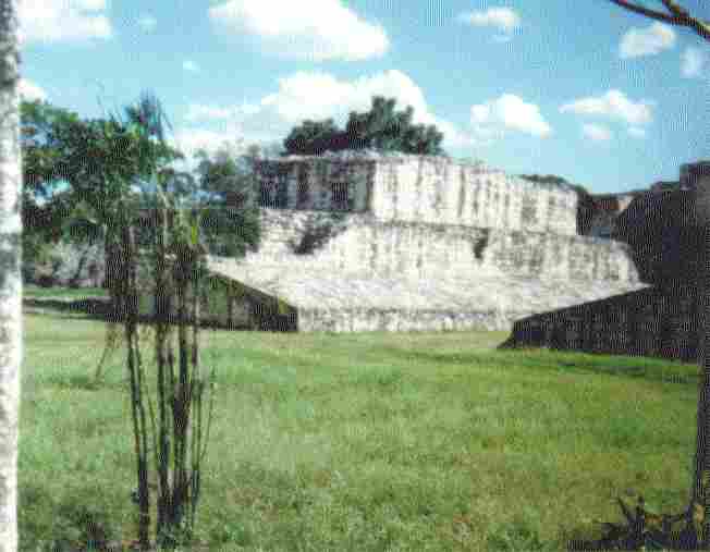 ![]() A small temple Cohune Palm In Left BG | ![]() Marvelous Maya Masks still Adorn the Main Temple under awnings | ![]() Stela, Main Plaza and an unexcavated Ball Court |