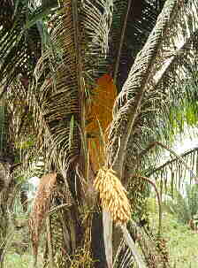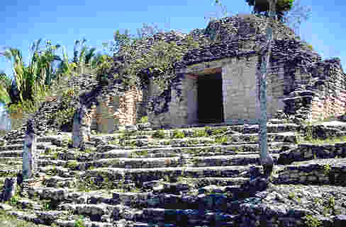 Down the road a few miles - Kohunlich - my favorite of all the trip - and I was out of film. Kohunlich is in a gracious park setting of the highest order, among a grove of magnificent Cohune palms (Orbignya cohune). It had wonderfully cut and squared stone. It appears that the stone is dolomite limestone, not uniformly cut but close, tightly bonded with lime mortar. The site is composed of 3 or 4 time period levels of occupation, the earliest appears to be of the highest craftsmanship. The Cohune palms are unusual, the fronds starting low from the base and extending 30-45 feet steeply up, very graceful and beautiful. This is the only place that I saw them. Here are some stock photos of Kohunlich.