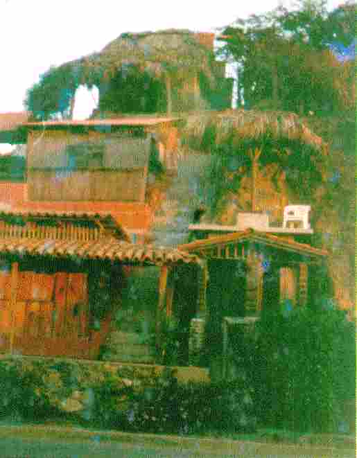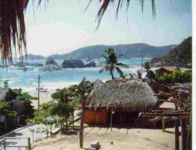 Puerto Angel - I must have come down 8000 feet, it is hot but a nice ocean breeze...I went through Angel, and on to Zipolite, looking for a motel, got to San Augostino, stopped where I saw cabanas for rent, and an American RV from Ohio. Barney and Dave are corn farmers from Ohio who have been wintering here for the past 20 years. My cabana was up about 50 steep steps above the road level onto a point of rocks, where it caught every breeze. It was basically a palm thatched palapa with the sides matted with woven corn or cane stalks, through which the breeze blew, very comfortable, and the bed was good, as was the hammock which was outside under the roof. The cabana was $30p per day.
