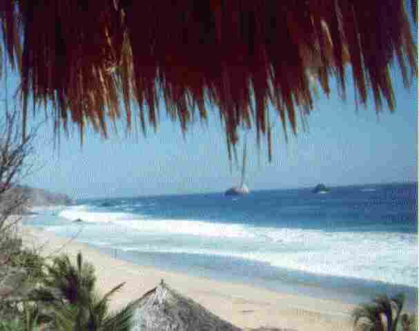 On down the coast on road high above the ocean, I stopped at El Mirador open thatched restaurant atop a point between magnificent beaches stretching for miles, breathtaking and cool. I ordered a Red Snapper meal. The fish was a 3 pounder served broiled over mesquite, whole, head guts feathers dressing and all, but with the hide diced for the spices to penetrate, I don't know what kind but excellent, with fresh lime, hand patted maize tortillas, tomatilla, onion and cabbage salad, picantes, a very excellent meal which kept me on through the day until night.