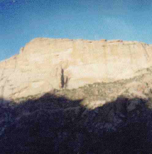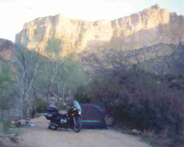 ![]() Camp in Apache Canyon Evening Sun on North Wall | ![]() The Old '75 GoldWing in Camp | ![]() Morning Sun - West Wall Treacherous dirt road down just above brush line |