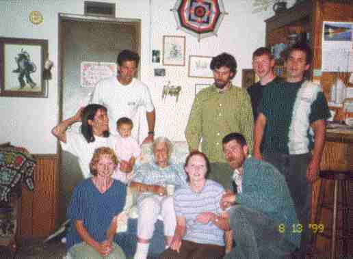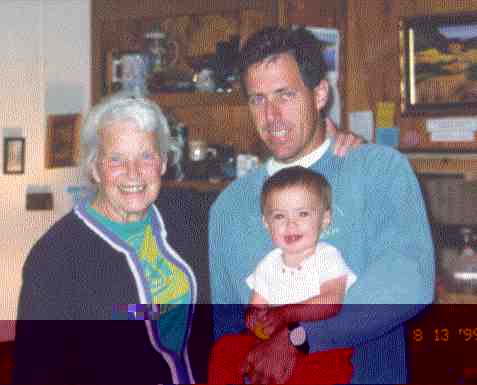 Brett, Christine, and Hayley Rose visited here at the ranch during their vacation from Aug 11 thru Aug 14, 1999 when we went over to the old ranch in Montana, and then they returned home. This is Mom with Grandson Brett and Mom's newest G'Granddaughter Hayley