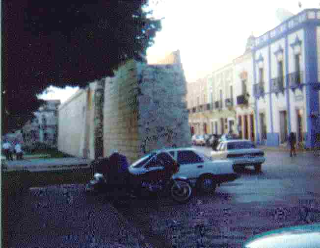 When I awoke, the day was just beginning to break. I made coffee, put on clean clothes and sat and smoked, the sea and wind quiet. I watched many troups of brown pelican passing by. I loaded the gear back on the bike, and rode back to Campeche, stopping to look at the old Spanish Fort on top of the hill to the south west of town about a mile. It was not open for visitors yet. Riding on in to the old section of town, I parked in the banking section at the end of a remnant of the old city fortification wall. I went into a Banamex to an ATM, but my funds had not been posted yet at home. I am in Eastern Standard Time, and my deposit is posted Pacific Standard Time..will have to wait.