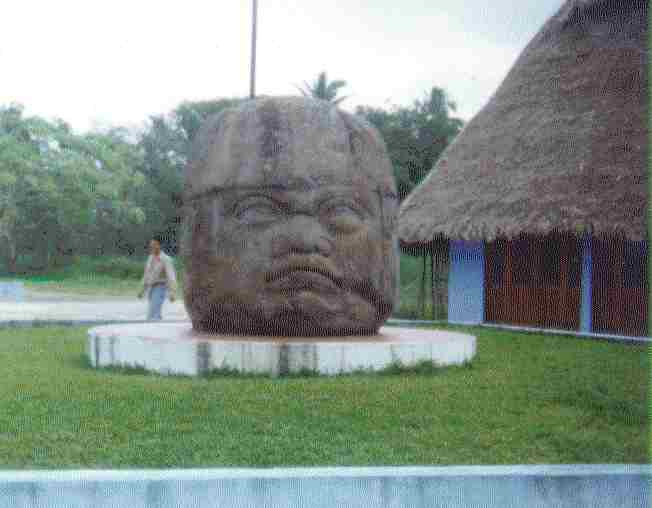 I turned off to the La Venta ruins. This is the ruins with the BIG Stone Heads .. 6 foot in diameter and 8 foot tall .. the ones you see in encyclopedias.. they are carved figures of the Olmec, dating from 1200-1400BC. There was one unrestored pyramid mound of clay and sand, undisturbed in a beautiful park setting. A number of raised platforms and mounds surrounding. The stone used for monuments is not native, but lava and serpentine transported by river raft for several hundred kilometers.
