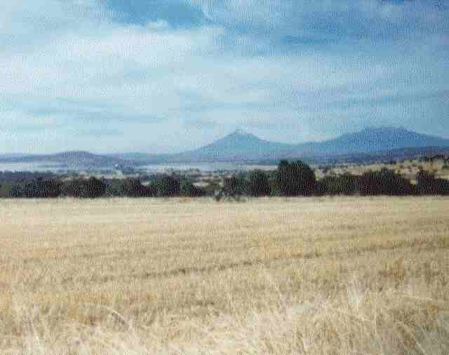 There was a competition and dancing display of Spanish masked dancers around the zocalo, a lead in to Carnival that night. A band of Mariachi started up in the pavillion in the zocalo. I sat and listened for a half hour, admiring the beautifully trimmed and sculpted shrubs and formal designed flower beds. By 5 it was cool enough for my jacket. I went on to Apizaco and got a motel. First class, and a HOT shower that wouldn't quit. I made hot tap water coffee, spread out all the damp gear, and hung up the coveralls. There was no heat in the room that I could find controls for, so I doubled over the blankets on a king size bed. I slept about 9 hours. When I awoke I got out my camp stove and made hot coffee, packed and gone by 8am. Nice clean town. On to Tlaxco and Apan. Good wheat field country, good fat range cattle, big John Deere Agency. I stopped on a rise to warm up, it was frosty, about 35 degrees. Took a picture down the valley of the Popocatepetl Volcano. Popo belched twice after I had shot the picture and that was the last on the roll. It spewed ash and steam in the air about 500 meters.