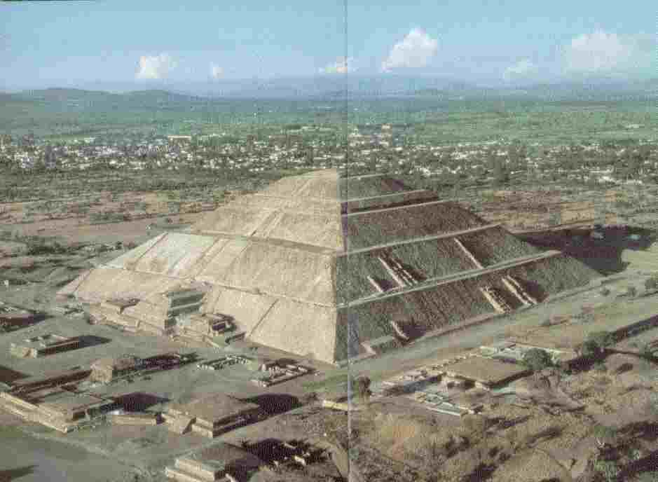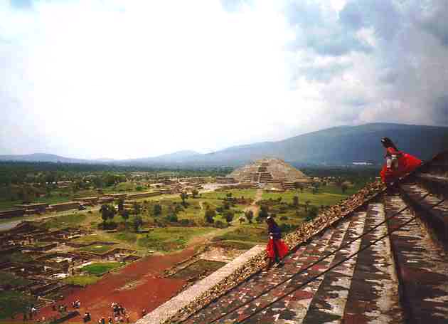 Back on the road to Teotihuacan, arriving about 2:45 after making a slight wrong detour of about 2 miles.. you have to watch those signs. It was Sunday, and all Mexican Ruins are open for free on El Dia del Domingo, thank God. Teotihuacan!!! The Pyramid of the Sun, the Feathered Serpent Pyramid, 200 meters square on the base and 60 meters high, and The Pyramid of the Moon. What I see are the two most impressive stacks of rock I have ever seen. Here is another link to Teotihuacan. And Another. I bought an extra roll of film for $40 pesos and a book on Teotihuacan - $50 pesos. It was now in the 70's in the shade and 80's in the sun, and it was getting more intense by the minute. I climbed the Pyramid of the Sun first off - sheesh - whoozy when I got up, and again when I got down...badly out of 'climbing in the sun' shape. Walked up and down the Avenida del Morte, the Avenue of the Dead, to the Pyramid of the Moon at the north end, admiring the workmanship of the structures lining the Avenida. I was getting too hot so I contented myself reading the book in the shade and looking down the other end of the Avenida with field glasses. After about 3 1/2 hours roasting I decided I needed some wind in my face, so I got back on the bike and headed into Mexico City to join up with the Autopista 57D going north to Queretaro.