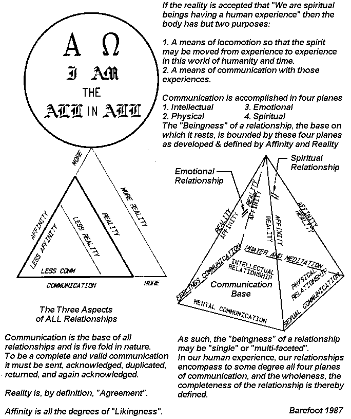 A number of years ago I was perusing in meditation the nature of all the relationships I had ever known in my life as the result of another relationship ending. In my searching for answers, I suddenly realized that there are but three aspects which governed and defined all the relationships I have known. Much to my chagrin, I realized I have known these truths from way back in the beginning. More appallingly, I also realized how much I have lacked in my ability to apply the truths which I know to my life in a successful manner. To the end of describing and defining for myself, (being an engineer who expresses and best presents his thoughts with pictures and sketches), I set about putting the pictures I was seeing in my mind on paper... These sketches are presented below in the order that I perceived them, one developing from the other, and undoubtedly still not totally defined or described in any degree of completeness. First, I needed to ask myself a question or two, like why was I or anyone else in a relationship? And the answer, of course, is to satisfy our physical, emotional, intellectual and spiritual needs, and not necessarily our wants. The flip side of that, again, is that if I am to have a satisfying relationship with another person to satisfy and fulfill my needs, then the responsibility for creating and maintaining the relationship rests with me, not the other person. Why? Their needs may already be met in the status quo, and they therefore perceive no need for change or growth. I also needed to make some definitions to help my understanding of this fact: All Relationships, with One's Own Self, with Others, and with One's Higher Power, are governed by but three fundamental aspects. They are: 1.) Communication, 2.) Affinity, and 3.) Reality. The first - Communication, the base of all relationships. I thought I knew all about communication. After all, I thought I had been communicating since I first became hungry and let out a squall. I find that I had been talking TO people for years, but that I had very seldom talked WITH another human being. I discovered that I had been doing "Partial Communication", incomplete and therefore not a true exchange. I find that True Communication is comprised of 5 actions, Transmission of Information, Receipt of Information, Acknowledgment of Receipt, Return Reply to Confirm the Data, and Acknowledgment of Return Receipt. In most cases, I had been simply involved in a one way spewing of data, never considering that for my data to have any validity the remainder of the actions were necessary. No wonder that I became frustrated with others not understanding what I thought I had said. The Communication was not complete, and my understanding of what I thought they understood had no basis for validity. I find that it is my responsibility to insure that all five actions are complete.