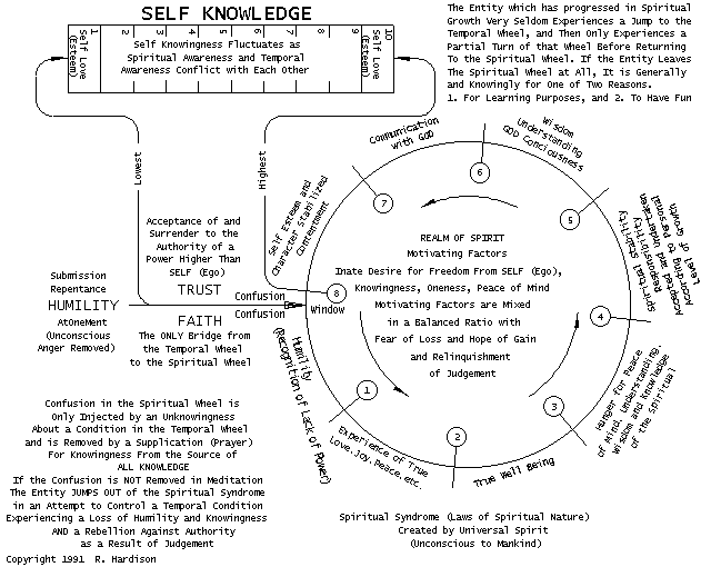 Next, I have taken the wheels apart, separating the temporal (earthly or material) from the spiritual. Each of the wheels next shown apply to both the above sets of wheels, for in actuality they are one superimposed upon the other. First, we see the Wheel of the Temporal Syndrome....The Laws of Human Nature governing the Temporal Actions of Mankind at the Conscious and Unconscious Levels.
