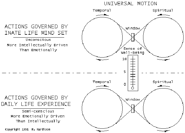 Next I asked myself why have I acted and reacted in thus and so manner, and it took a lot of searching to begin to understand that I and everyone else is governed by a set of Laws, so to speak, the Laws of Human Nature. These are demonstrable and repeatable. I realized that the motions and laws could be depicted as a pair of wheels counter-rotating as if cross belted, in actuality two sets of wheels to describe the actions and reactions we perceive.