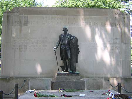 Various messages engraved on the wall of the memorial include: "Freedom is a light for which many men have died in darkness"; "The independence and liberty you possess are the work of joint councils and joint efforts, of common dangers, suffering, and success [Washington Farewell Address, Sept. 17, 1796]"; and "In unmarked graves within this square lie thousands of unknown soldiers of Washington's Army who died of wounds and sickness during the Revolutionary War."