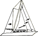 Initially I was looking to discard the inefficient mainsail, and replace it with a clean leading-edge jib-hanked, freefooted sail, which would be acting in a parallel, harmonious fashion with the jib or genoa, and with no mast spreader overlap so they might be sheeted in for optimum pointing. I first envisioned two masts joined at the top, replacing the shrouds, with a vertical stay for the leading edge of the main, rigged "Bermudian" fashion but loose footed. One primary object was to have a light mast "gin pole" arrangement that could be lowered easily to pass under overhead obstructions. I discarded this idea as there was no easy solution to having the long thin unstayed or jumpered masts strong enough to not vibrate or fail in compression, short of the expense of carbon fiber sticks.